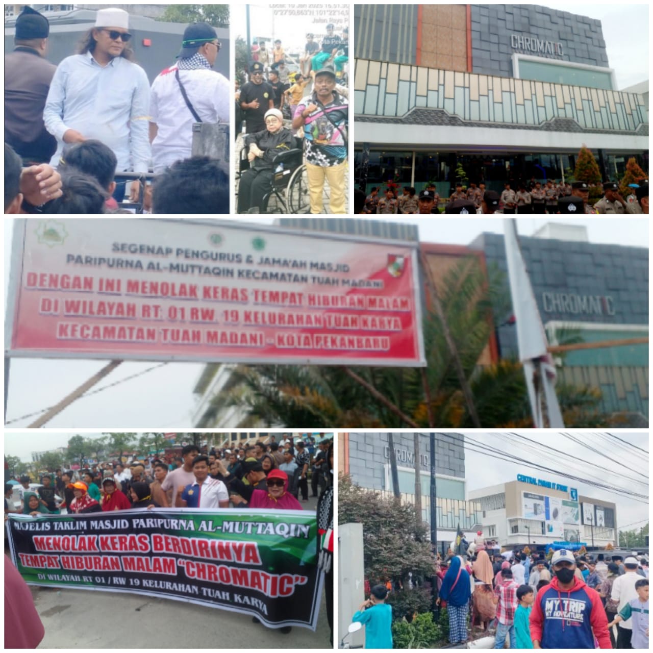 Pekanbaru, Eradigitalnews.com : Ratusan warga yang tergabung dalam Forum Anti Maksiat (FAM) melakukan aksi demonstrasi di depan Chromatic Family Karaoke, Jalan HR Soebrantas, Kota Pekanbaru, Jumat (10/01/2025). Mereka menuntut tempat hiburan malam tersebut segera ditutup, karena diduga menjadi lokasi maksiat dan penjualan minuman beralkohol.