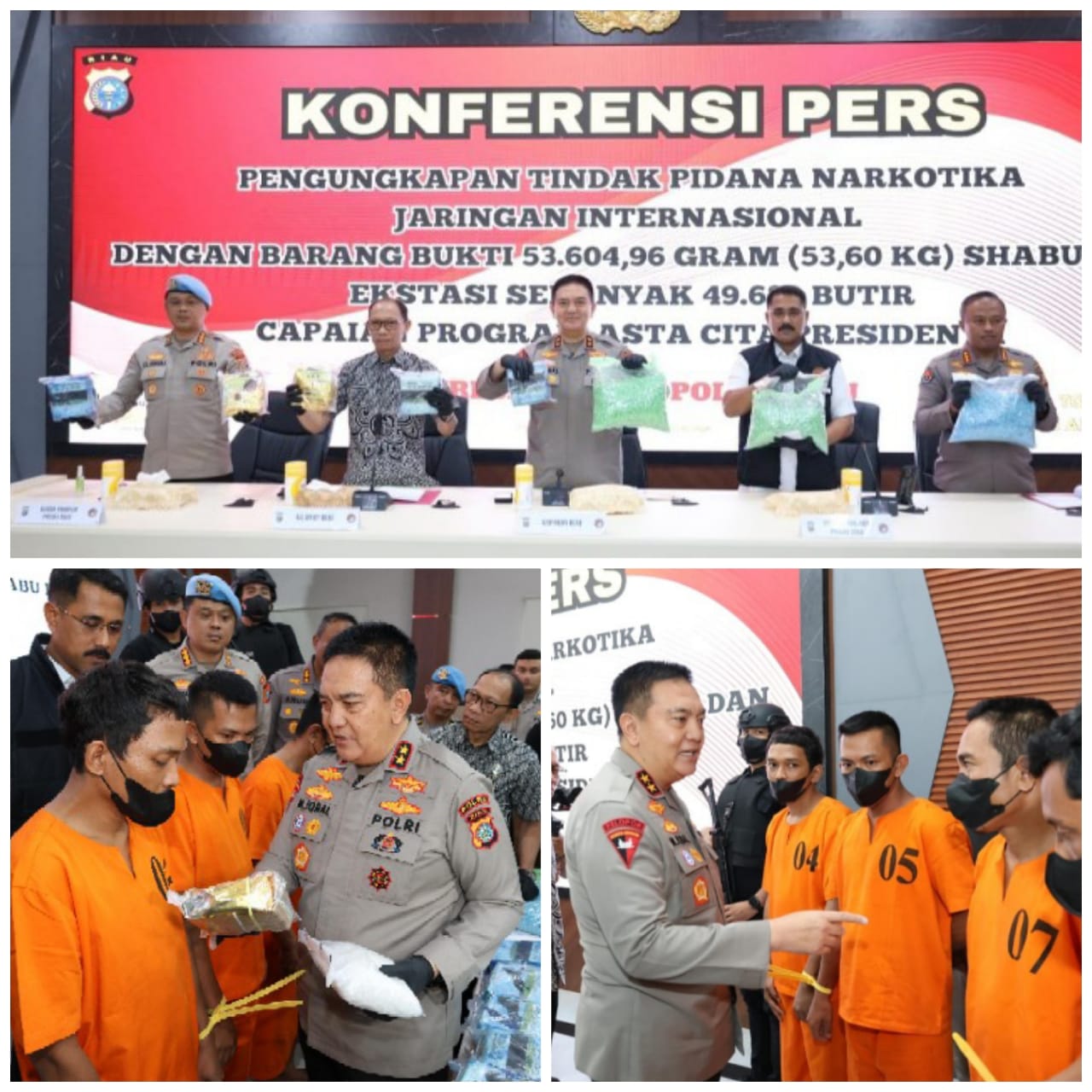 Kapolda Riau Irjen Mohammad Iqbal, S.I.K., M.H., pada kesempatan tersebut menyampaikan, dari ungkap kasus ini, Ditresnarkoba Polda Riau mengamankan barang bukti 53,60 Kilogram Shabu dan 49.682 Butir Ekstasi yang bisa menyelamatkan 317.000 jiwa.