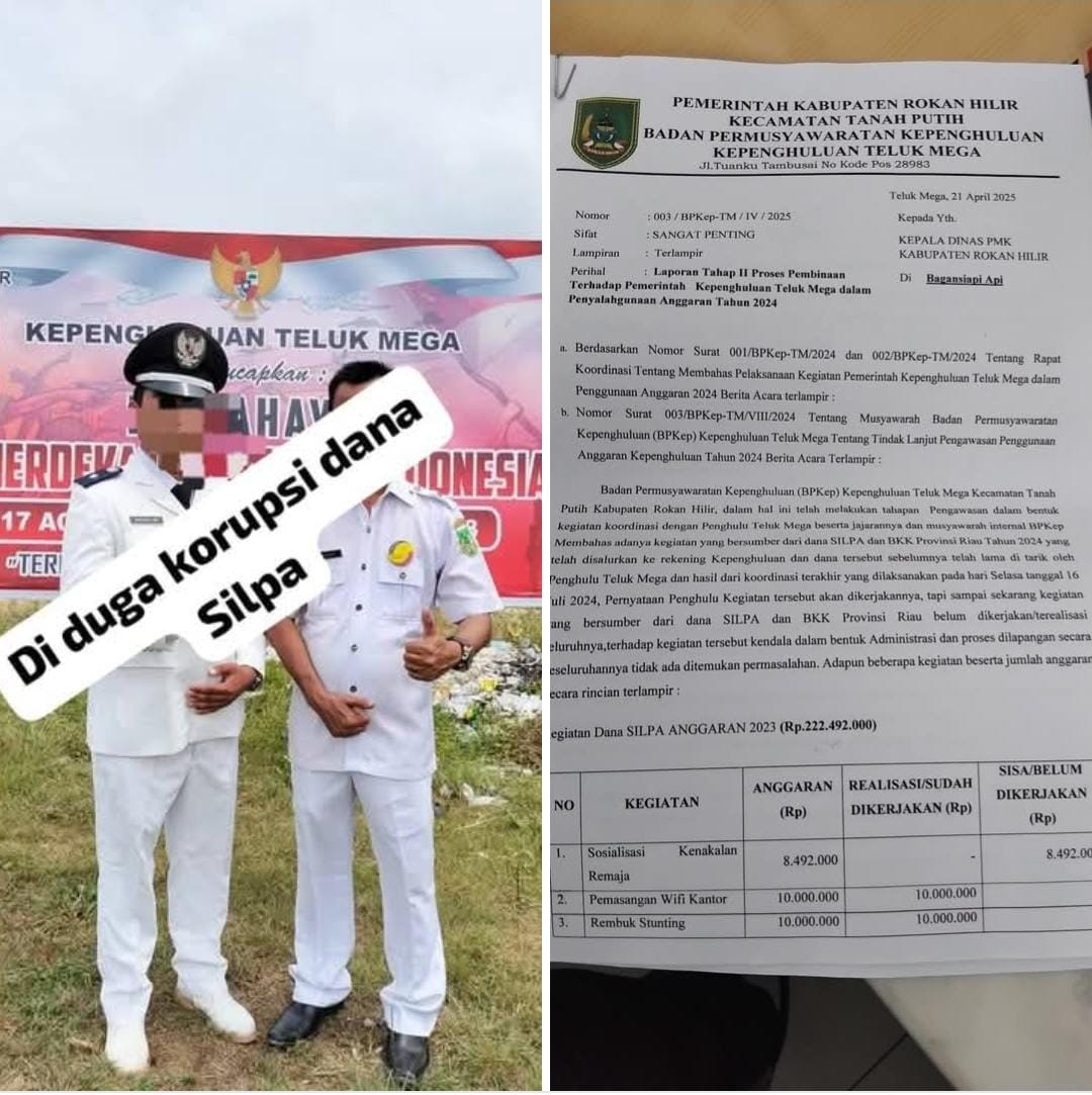 Penyalahangunaan anggaran terhadap kegiatan-kegiatan yang bersumber dari dana SILPA dan BKK Provinsi Riau yang belum dikerjakan dan yang belum diselesaikan oleh Pemerintah Kepenghuluan Teluk Mega, kecamatan Tanah Putih, Rokan Hilir, Masyarakat merasa dirugikan dan menjadi dampak buruk proses perkembangan dan pembangunan di Kepenghuluan Teluk Mega.