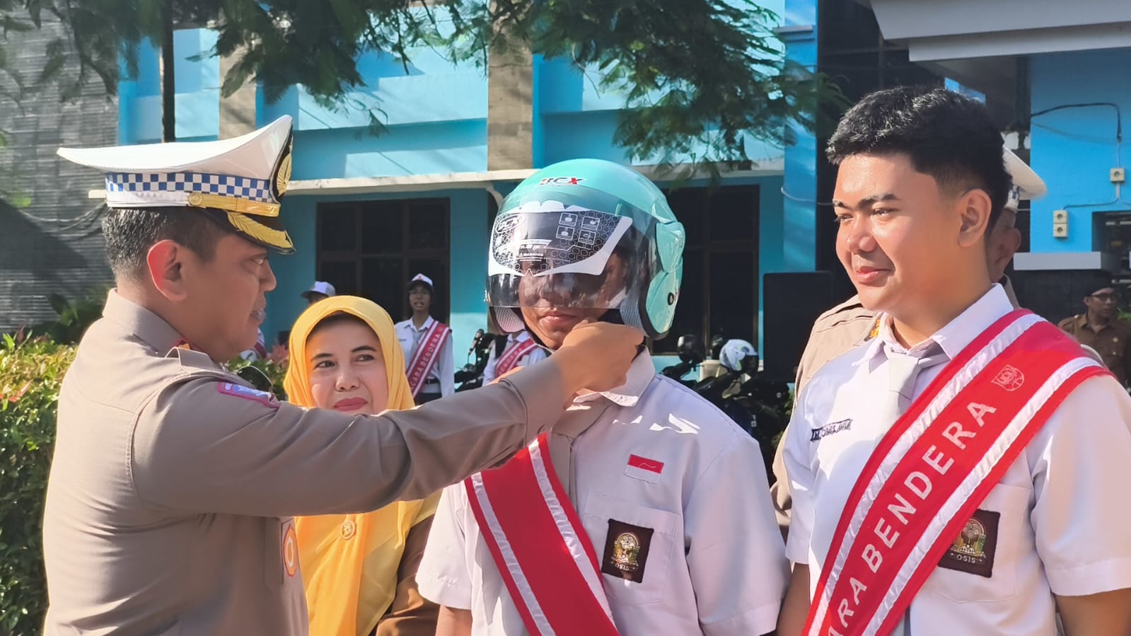 Dalam kesempatan tersebut, Dirlantas Polda Riau turut membagikan puluhan helm SNI, tumbler, dan brosur keselamatan lalu lintas kepada siswa-siswi sebagai simbol kepedulian terhadap keselamatan berkendara.