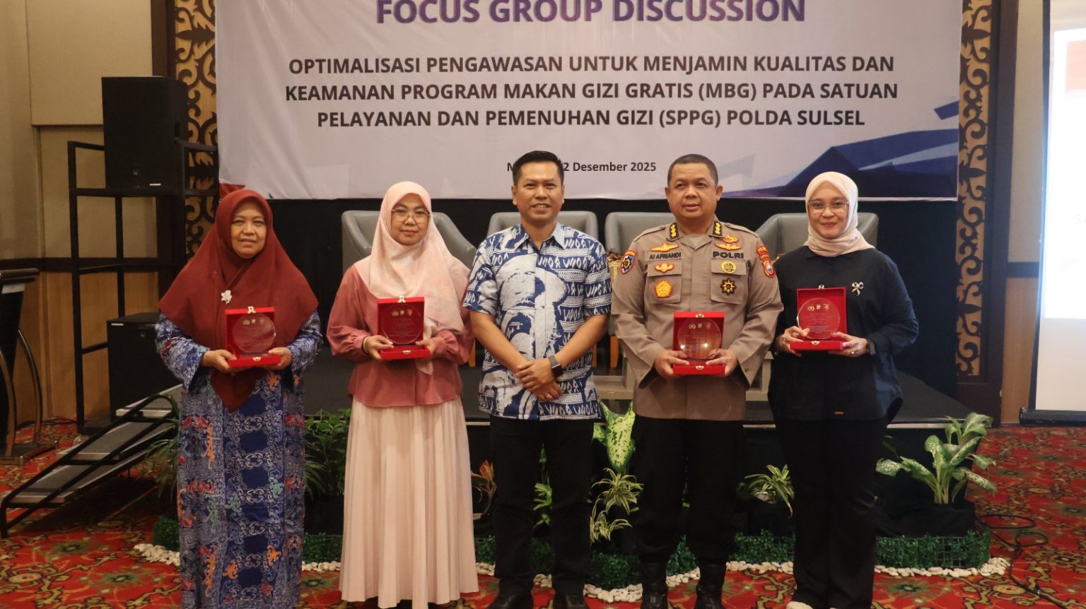 FGD ini menghadirkan sejumlah narasumber kompeten, di antaranya Prof. Dr. Nur Haedar Jafar, S.Pt., M.Kes (Pakar Gizi FKM Unhas), Hariani Jompa, SKM., M.Kes (Ahli Gizi Dinas Kesehatan Provinsi Sulsel), Kombes Pol. Ai Afriandi, S.H., S.I.K., M.M (Irwasda Polda Sulsel), serta Dr. dr. Muji Iswanty, S.H., M.H, Sp.DVE, Subsp.Ven, M.Kes, CMed selaku moderator.
