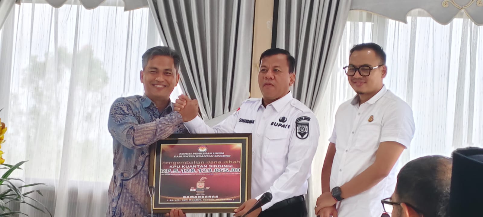 Kuantan Singingi , Eradigitalnews.com : Komisi Pemilihan Umum (KPU) Kabupaten Kuantan Singingi secara resmi mengembalikan sisa dana hibah penyelenggaraan Pemilihan Kepala Daerah (Pilkada) kepada Pemerintah Kabupaten Kuantan Singingi Nilai dana yang dikembalikan tersebut tercatat sebesar Rp 5.1 Milyar sebagai bagian dari optimalisasi anggaran yang bersumber dari hibah Pemerintah Daerah di tahun 2024