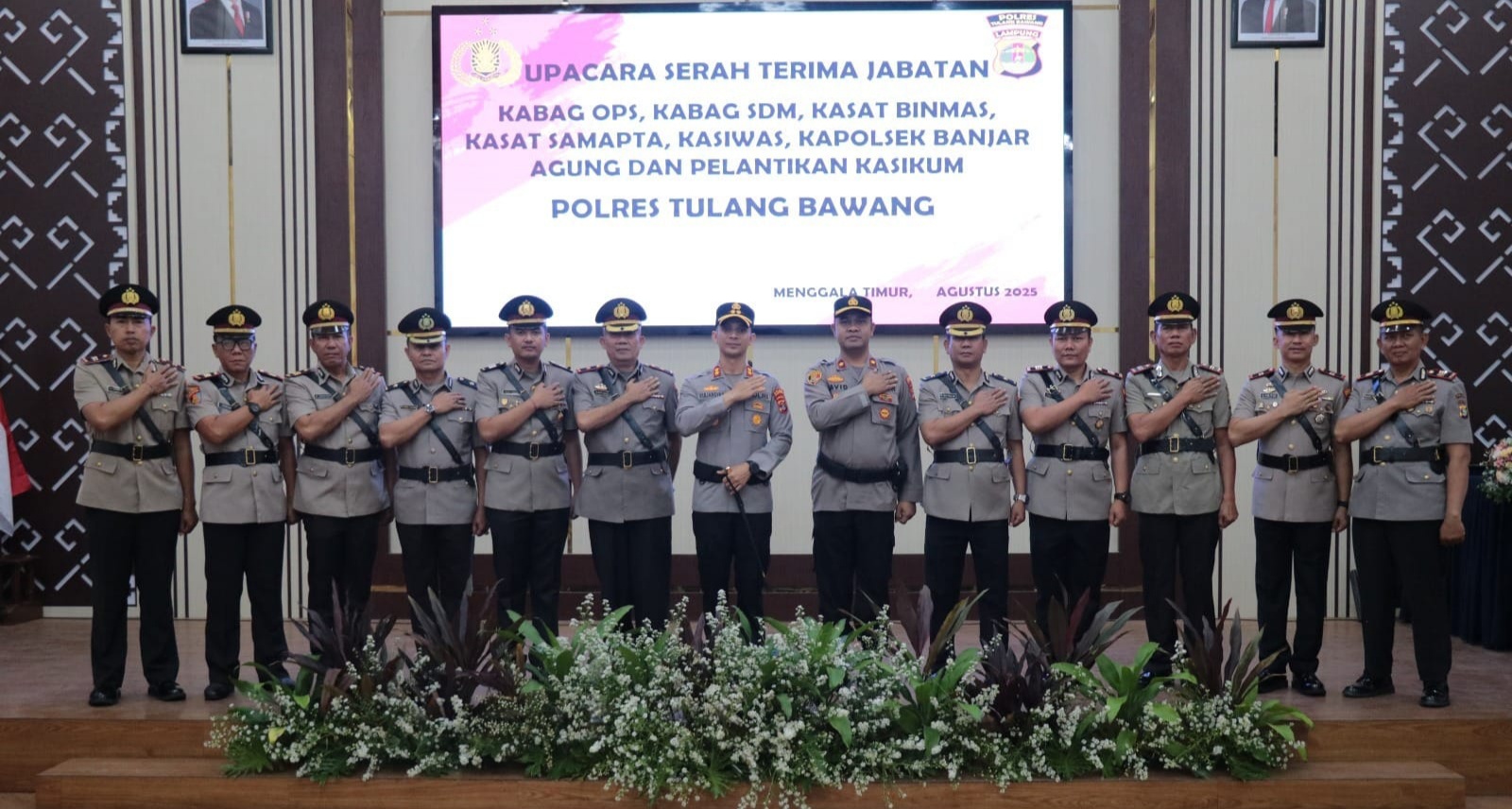 “Hari ini, kami menggelar upacara sertijab Kabag Ops, Kabag SDM, Kasat Samapta, Kasat Binmas, Kasi Pengawasan (Kasiwas), dan Kapolsek Banjar Agung, serta pelantikan Kasi Hukum (Kasikum) di Aula Wira Satya Mapolres Tulang Bawang,” ucap AKBP Yuliansyah.