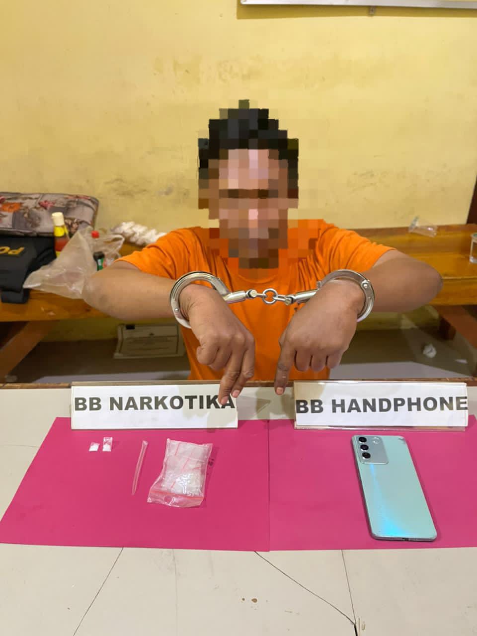 Saat dilakukan penggeledahan dengan disaksikan oleh ketua pemuda Desa Penghidupan, petugas menemukan barang bukti berupa 2 paket diduga narkotika jenis sabu yang dibungkus dengan plastik klip bening (0.21 gram), 1 buah plastik klip kosong, 1 buah plastik sendok sabu, 1 unit handphone Android merk VIVO V 27 E warna hijau.