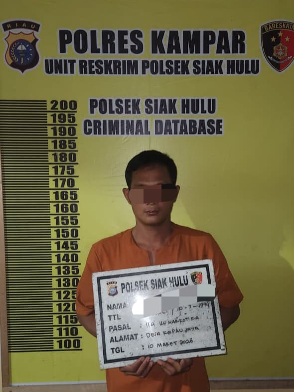 SIAK HULU, Eradigitalnews.com : AM (32) tidak hanya bisa pasrah saat ditangkap Polsek Siak Hulu, pasalnya ia ditangkap karena peredaran Narkoba jenis sabu-sabu di Kampung Baru Desa Kepau Jaya Kecamatan Siak Hulu Kabupaten Kampar, Senin (9/3/2026) sekira pukul 22.00 Wib.