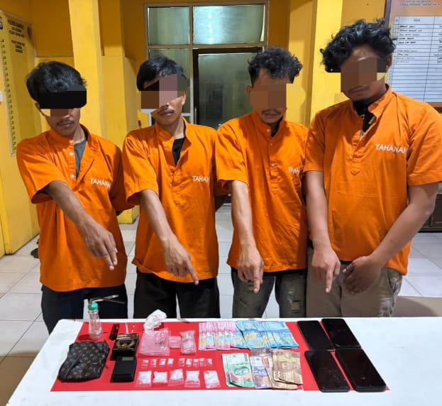 Keempat pelaku adalah AR (30) warga Desa Kijang Jaya, EK (31) warga Desa Gerbang Sari, GE (20) warga Desa Kijang Jaya dan IR (31) warga Desa Kijang Makmur. “Dari hasil penggeledahan ditemukan barang bukti jenis sabu sabu dengan berat bruto 24,58 Gram dan barang bukti lainnya,”jelas Kapolres Kampar AKBP Boby Putra Ramadhan S melalui Kapolsek Tapung Hilir AKP Khairil, Rabu (3/12/2025).