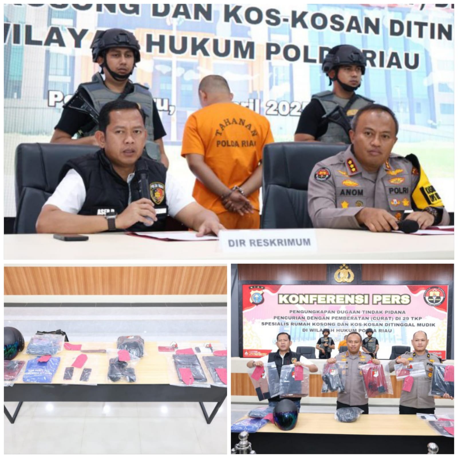 Pekanbaru , Eradigitalnews.com : Polda Riau melaksanakan Konferensi Pers di Gedung Media Center Mapolda Riau, terkait Pengungkapan tindak pidana Curat pembobol rumah Spesialis Rumah Kosong dan Kos-Kosan yang ditinggal mudik. Senin (7/4/2025).